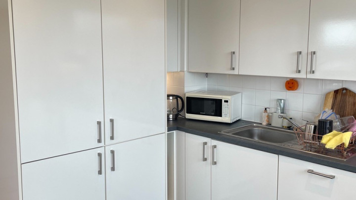 The kitchen is white cabinets with integrated oven, dishwasher and fridge/freezer unit. The lounge and kitchen are open plan with access to the balcony. All white goods are included in the sale (dishwasher, washing machine, oven, fridge/freezer).