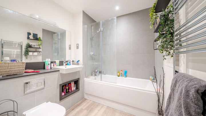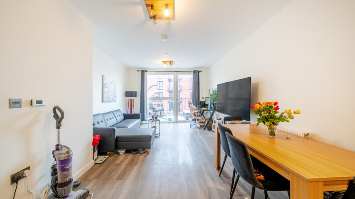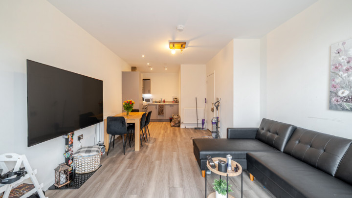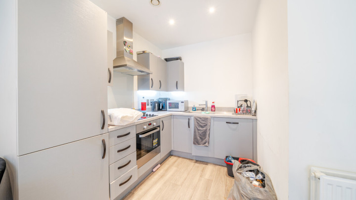 An entrance hall with storage cupboards welcomes you into this beautifully presented appartment. The property is full of natural light. The large, open-plan living area, incorporating a modern kitchen which consists of modern light grey units. It benefits from integrated appliances. The open plan living area leads directly on to a private balcony which is good for relaxing and entrtaining. A generous sized bedroom includes built in storage. The accommodation is completed with a good sized contemporary bathroom which has a three piece suite with shower over bath and lovely light grey tiling.