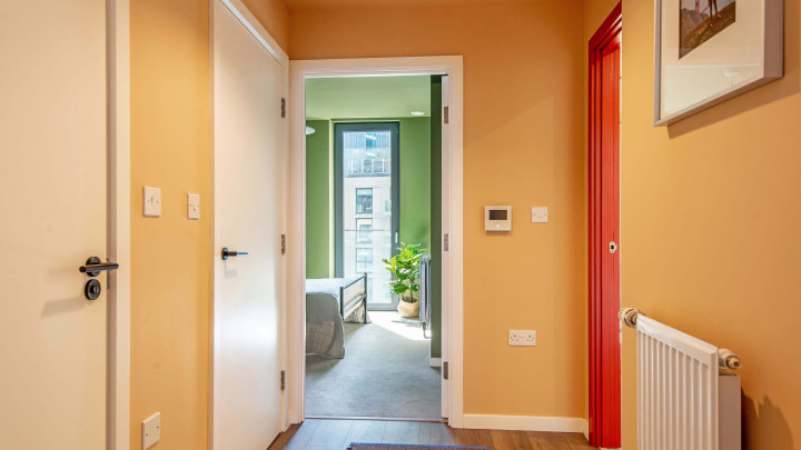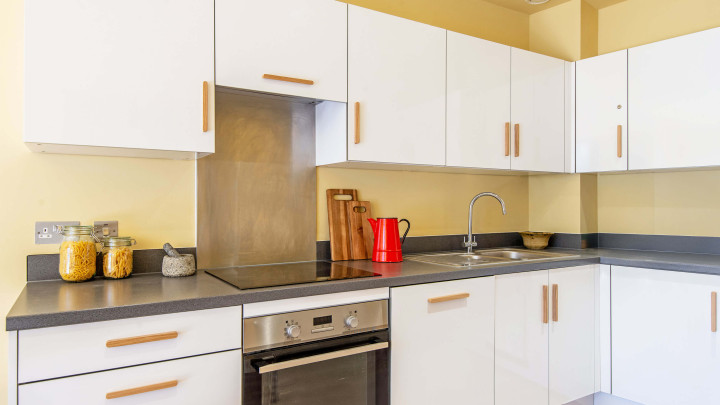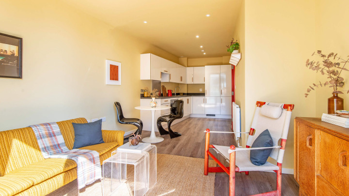 The sunny yellow living space is accented by bold red, and the bedroom in deep green makes it feel like you've stepped into a soothing hideaway. Everything has been designed with practicality in mind. The contemporary kitchen has ample space to house all your appliances, and there's not one but two good-sized storage cupboards for all of life's other bits.