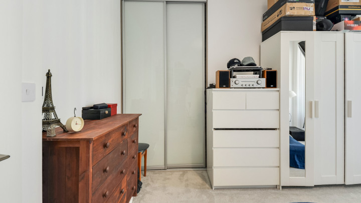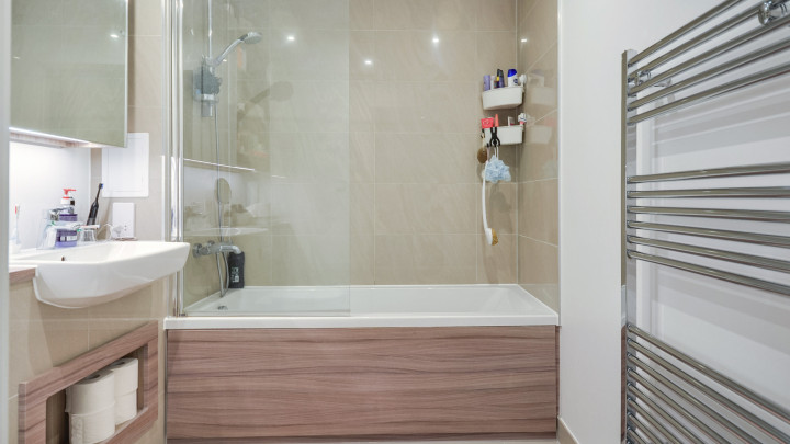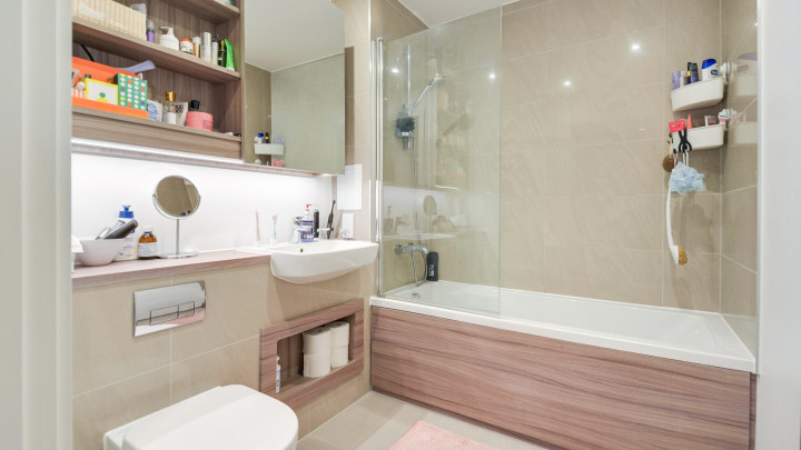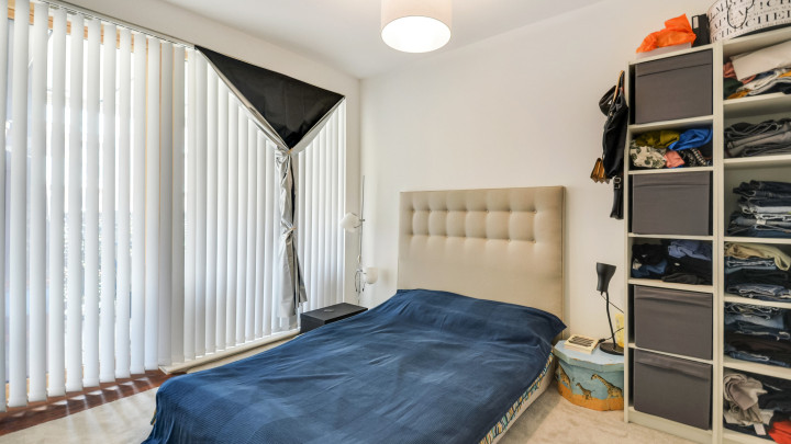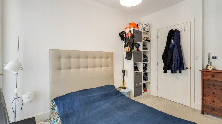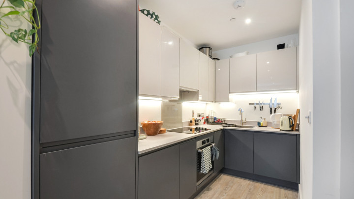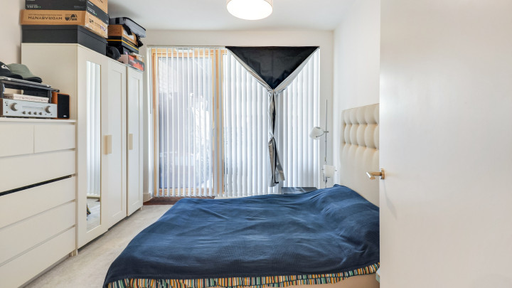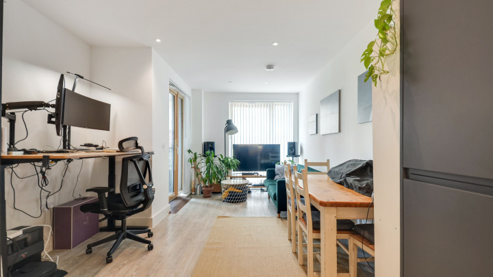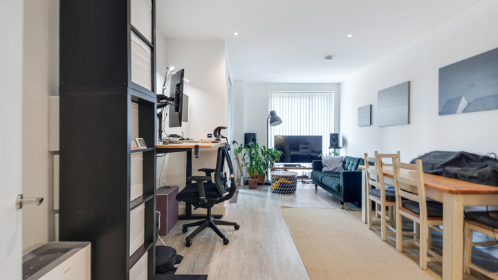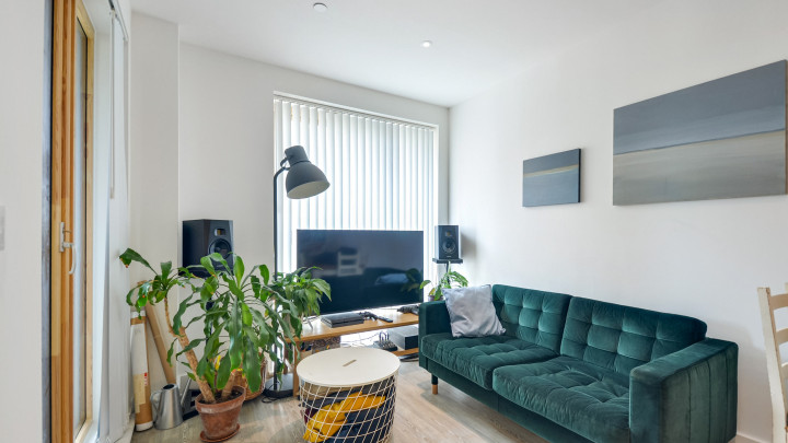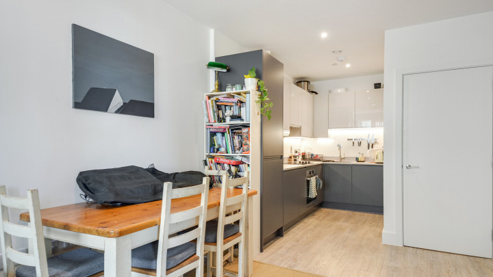The open-plan kitchen and living area is equipped with high-quality integrated appliances, including a Zanussi dishwasher and fridge freezer, Bosch electric hob, and washing machine. The bedroom is well-proportioned and the bathroom is sleek and modern. Additional benefits include secure bike storage and access to a well-maintained communal garden