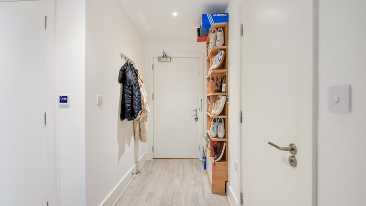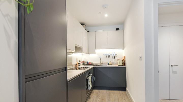 Located on the first floor of the contemporary Crane Court, this stylish one-bedroom apartment offers a perfect combination of comfort and convenience. Designed with modern living in mind, the property features floor-to-ceiling windows that flood the interiors with natural light, underfloor heating throughout, and a private balcony perfect for enjoying morning coffee or evening relaxation.