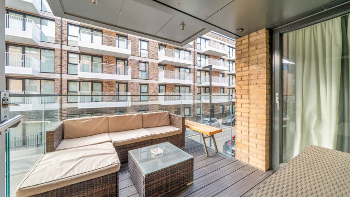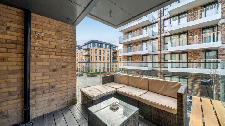 Outside, there is a large south-facing private balcony, which the living room can access, as well as shared garden areas.