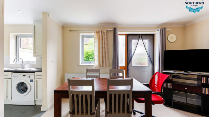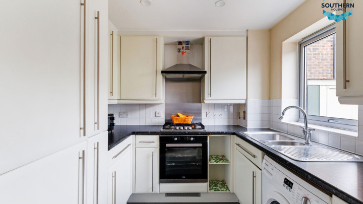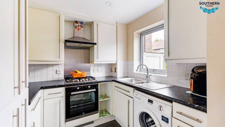 The modern kitchen is equipped with an integrated oven, hob, and extractor fan, along with ample storage and counter space to accommodate all your culinary needs.