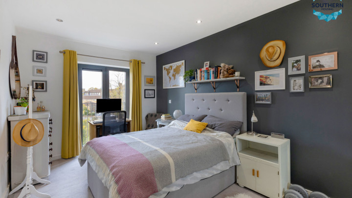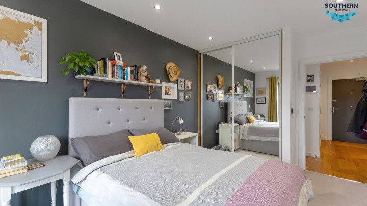 The spacious double bedroom offers a calm and comfortable retreat, complete with an integrated wardrobe to help maximise space and maintain a clean, uncluttered look. There's plenty of room for additional furnishings, and large windows ensure the space feels warm and inviting.