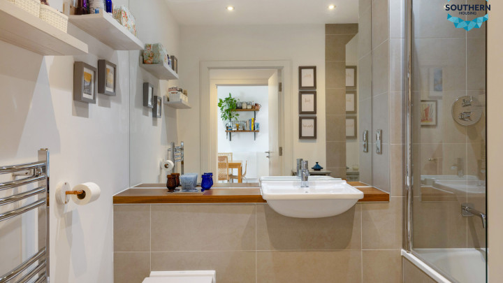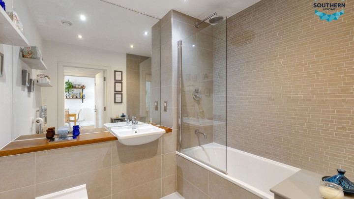 The modern bathroom is finished to a high standard, featuring sleek tiling, a contemporary suite, and a combination bath and shower. The design provides both practicality and a touch of luxury, perfect for unwinding at the end of the day.