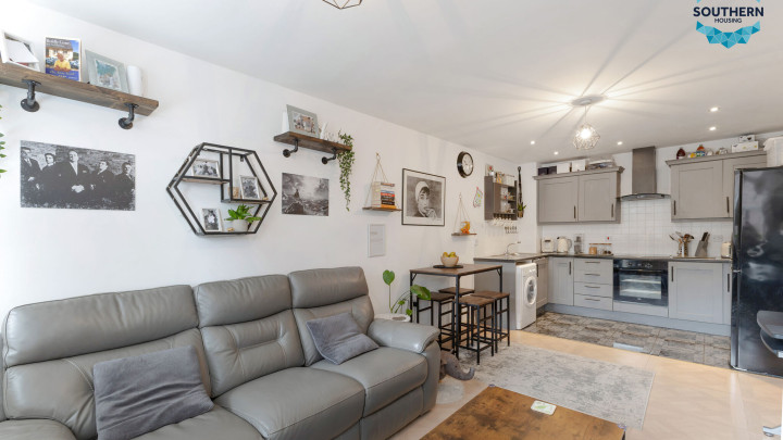 The heart of the home is the generous open-plan living space, which seamlessly combines the lounge, dining area, and kitchen. South-facing windows flood the room with natural light, creating a warm and inviting atmosphere. The living area offers ample room for both relaxation and entertaining, while the modern kitchen boasts extensive countertop space and plenty of storage.
