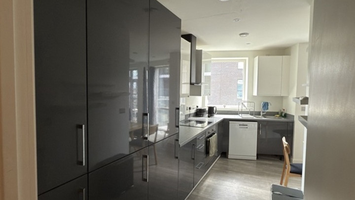 - Modern fitted kitchen has a mix of gloss base and wall units, integrated oven, electric hob with extractor above, integrated fridge/freezer and washing machine, with space for dishwasher