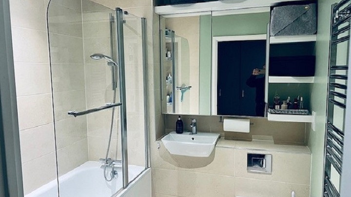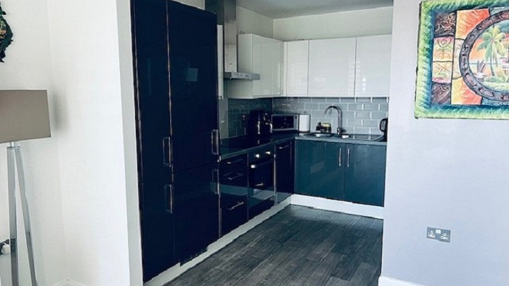 - Fully fitted Manhattan high gloss kitchen, white and anthracite split, with glass splashback. Integrated appliances (fridge freezer, washer dryer, oven, ceramic hob and glass cooker hood.)
