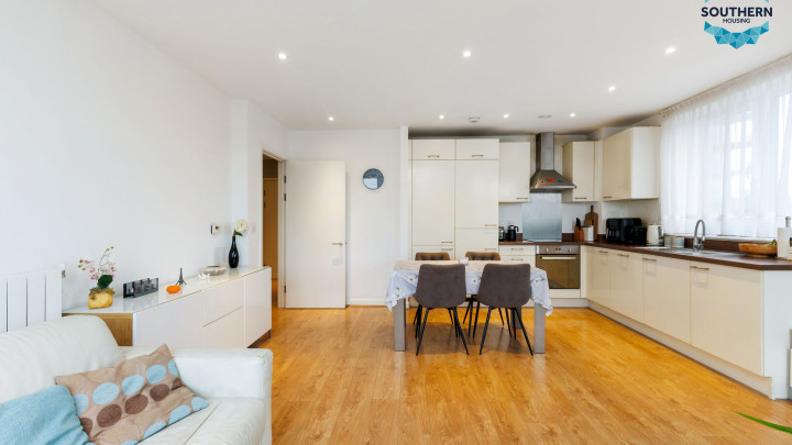 The heart of this home is the large, airy, open-plan kitchen and living area. Featuring large windows throughout, the space is flooded with natural light, creating an ideal environment for entertaining or day-to-day living. This main reception room benefits from direct access to a private balcony, a peaceful spot to enjoy your morning coffee or unwind in the evening. The kitchen is well-equipped with integrated appliances including an oven, hob, extractor fan, and fridge/freezer, and offers generous countertop space and storage.
