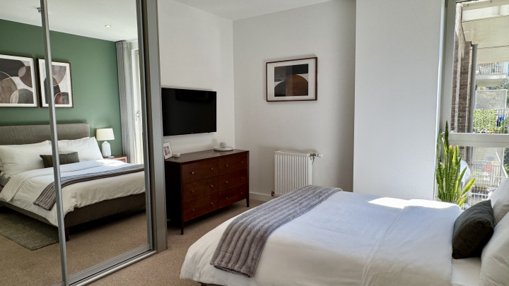 The generously sized bedroom includes built-in double mirrored wardrobes, providing ample storage space.