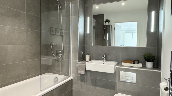 The stylish bathroom is finished to a high standard, featuring quality porcelain tiles, a large built-in mirror, and a semi-recessed basin and bath/shower.