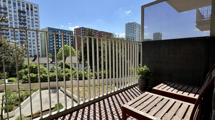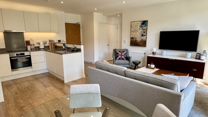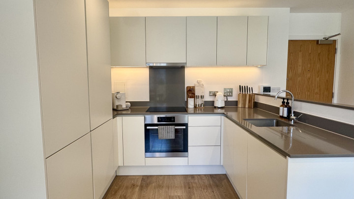 The apartment benefits from a bright and spacious open-plan living area, ideal for relaxing, dining and entertaining. The living space has plenty of natural light from full-height windows that lead onto a private balcony with views over a landscaped courtyard.