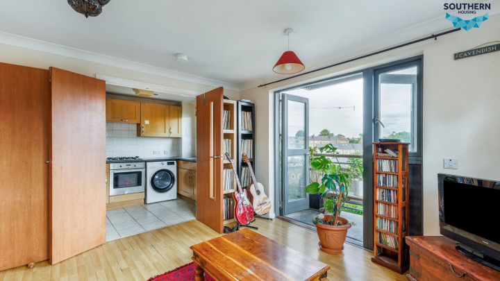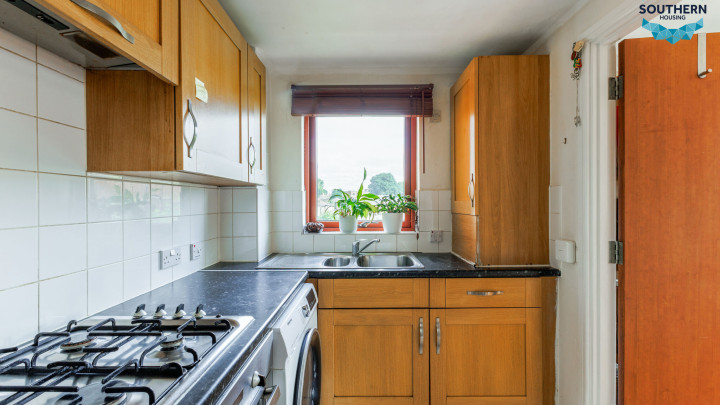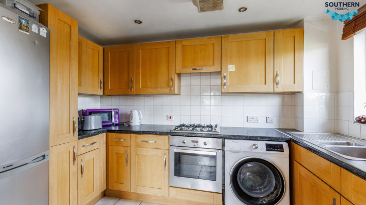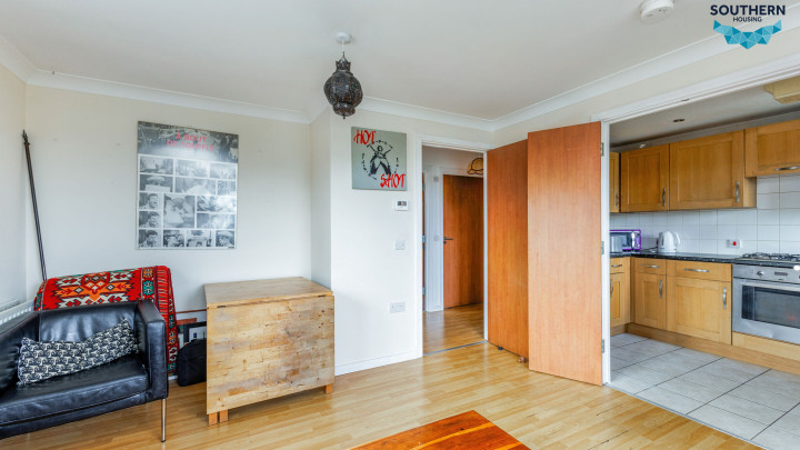Next is the open plan living room/dining area. This space offers lots of natural light and has space for separated living and dining areas if you wish. You also have access to the kitchen, which can be separated from the living area. The kitchen is well equipped with an integrated oven and hob and has lots of storage and counter space.
