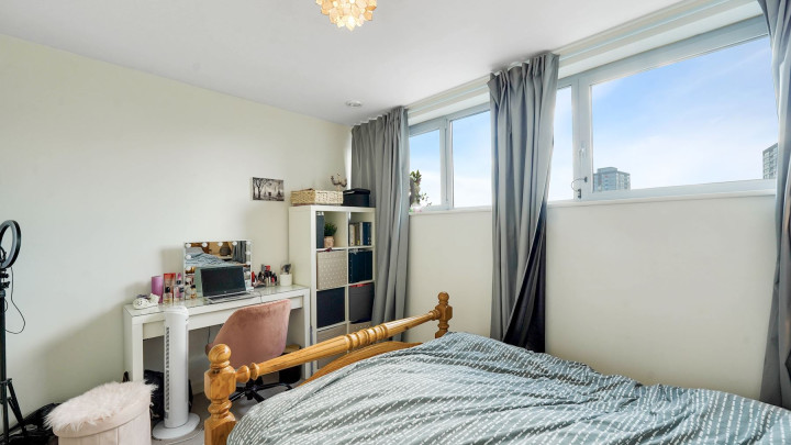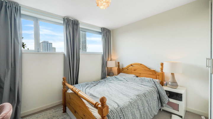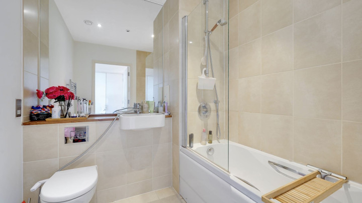 Flat 36, 3 Rick Robert's Way, London, welcomes you with its bright, modern charm and cozy ambiance. The bathroom invites with its warm recessed lighting and a stylish bathtub with shower, complemented by a sleek sink and toilet with bidet. The bedroom offers a snug retreat with glowing natural light from large windows and a chic ceiling fixture, plus a built-in wardrobe. The living room opens up with radiant floor-to-ceiling windows and soft recessed lighting, leading to a delightful balcony. The kitchen/dining area shines with natural light and elegant pendant lighting, featuring sleek cabinetry and a cozy dining nook. The hallway greets you with gentle overhead lighting and handy storage. The balcony enchants with its sunny views of the London skyline. The property benefits of an allocated parking space in a secure underground car park.
