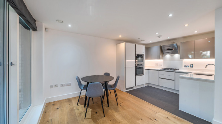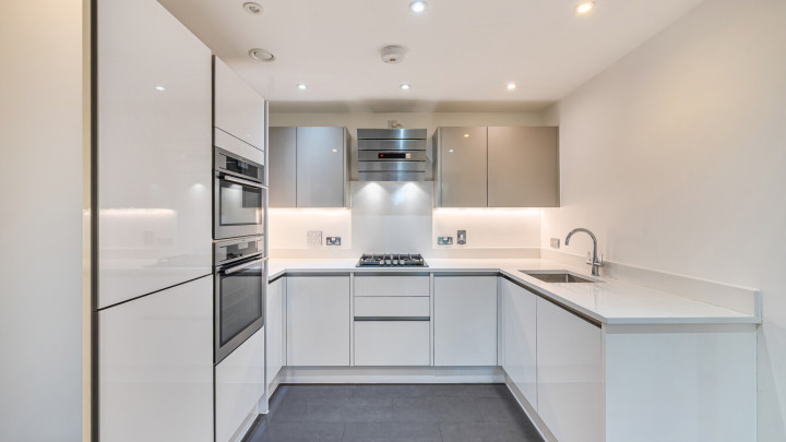 The sleek fitted kitchen offers ample storage and is equipped with integrated appliances including a gas hob, oven, and microwave, making it well-suited for both day-to-day use and entertaining.
