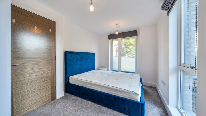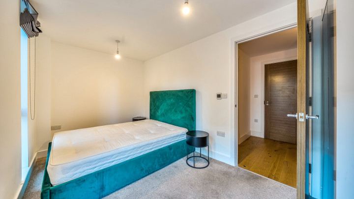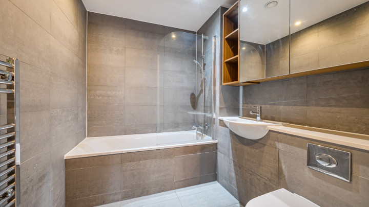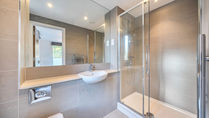 There are two generous double bedrooms, with the principal bedroom benefitting from an en-suite shower room. Both bathrooms are finished to a high standard with contemporary tiling, built-in storage, and chrome towel rails.