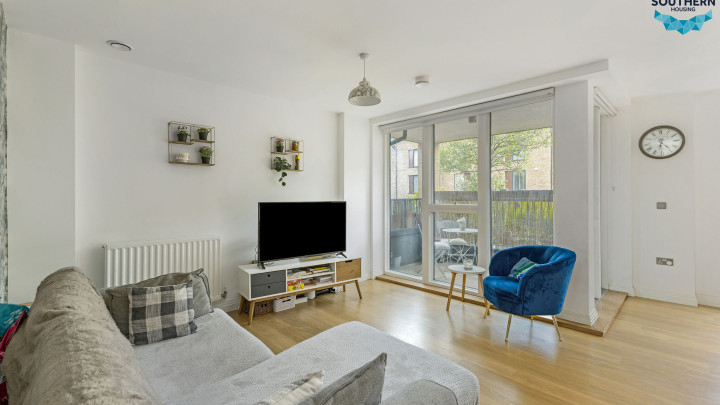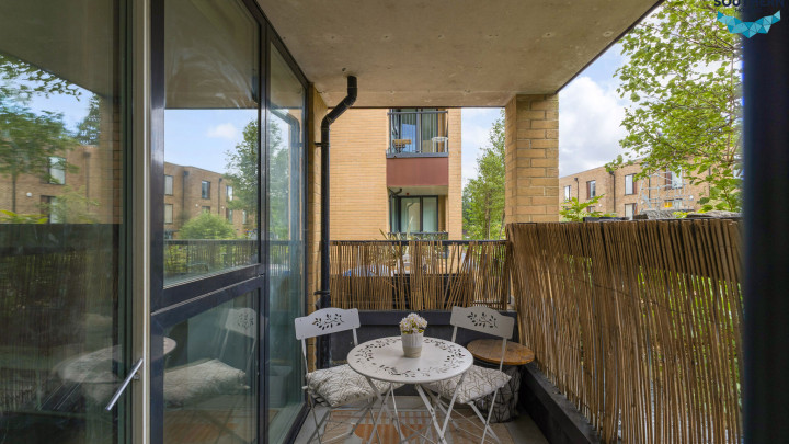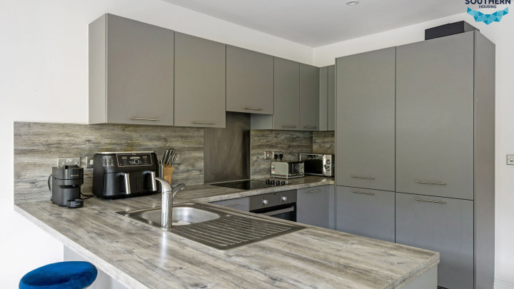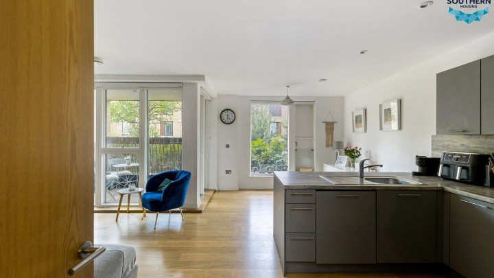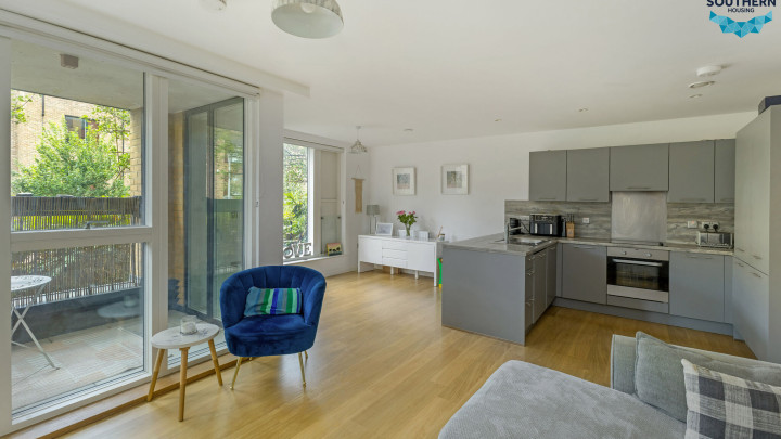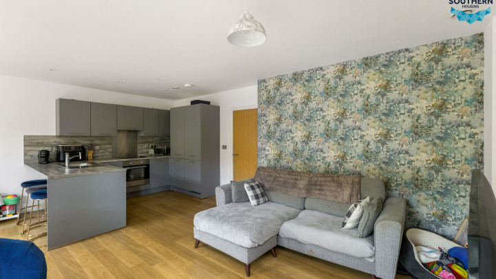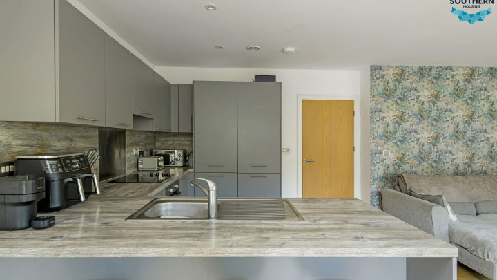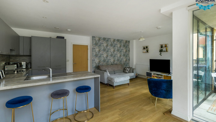 This leads through to the open-plan living room and kitchen. This generous space allows for both a comfortable lounge and a separate dining area. Natural light floods the room through large windows and doors that lead to your own private balcony. The kitchen boasts a sleek, modern design with ample storage and counter space, and comes equipped with a hob, extractor fan, oven, and fridge freezer.