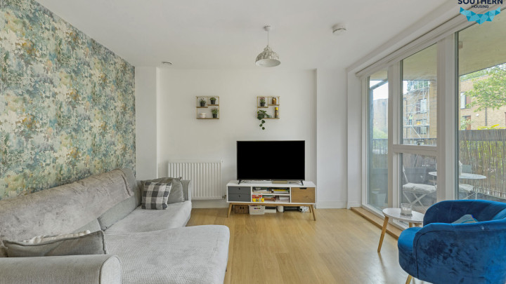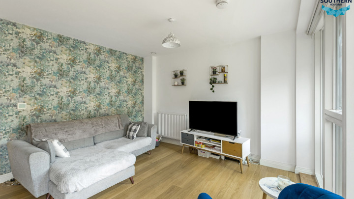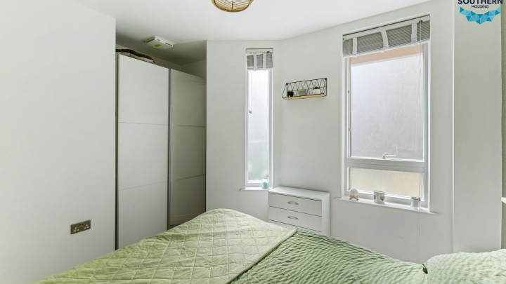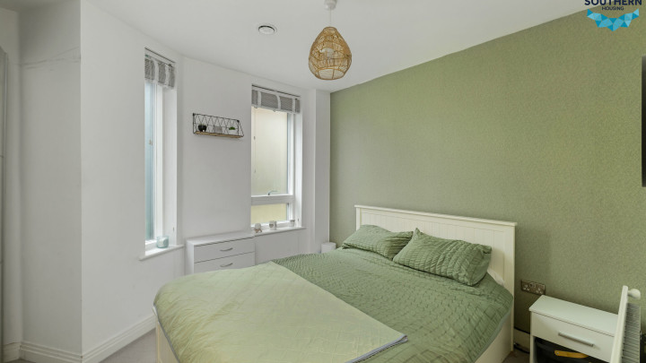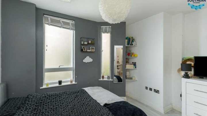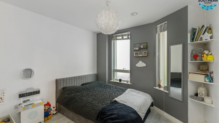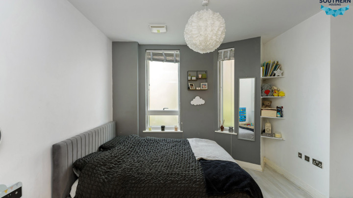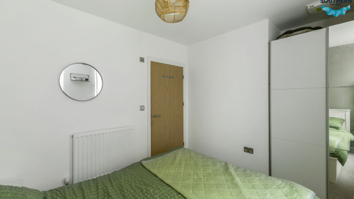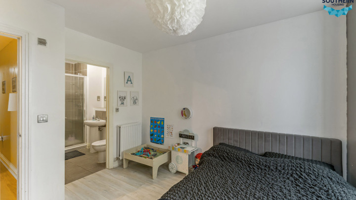 The master bedroom is generously sized and includes a modern en-suite bathroom with a walk-in shower. The second bedroom is also a good size, making it perfect as a double bedroom, a child's room, or a spacious home office.