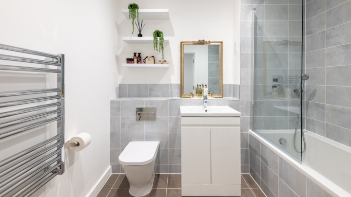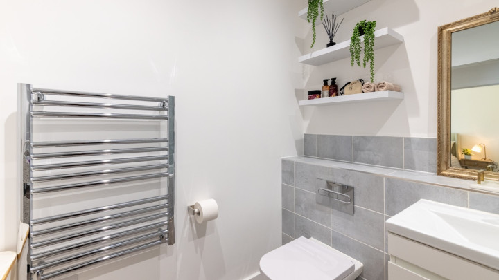 A generously sized double bedroom features a fitted wardrobe, while the modern bathroom offers grey tiling, a clean white suite, chrome mixer tap, electric heated towel rail and an over bath shower with glass screen.