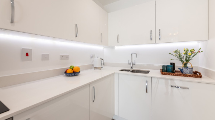 The open plan living area flows into a semi separate modern kitchen, fully fitted with integrated appliances including an oven, hob, extractor hood, fridge freezer and dishwasher. Sleek white cabinetry with chrome finishes and under cabinet lighting completes the contemporary feel.