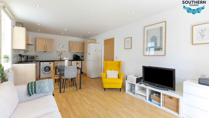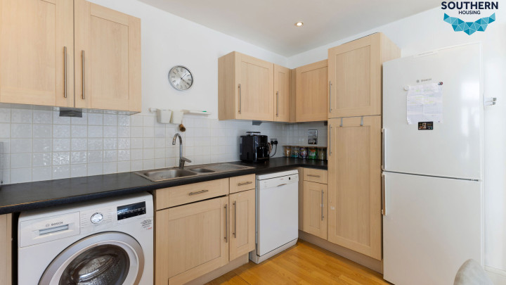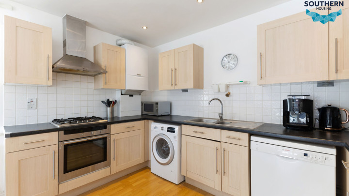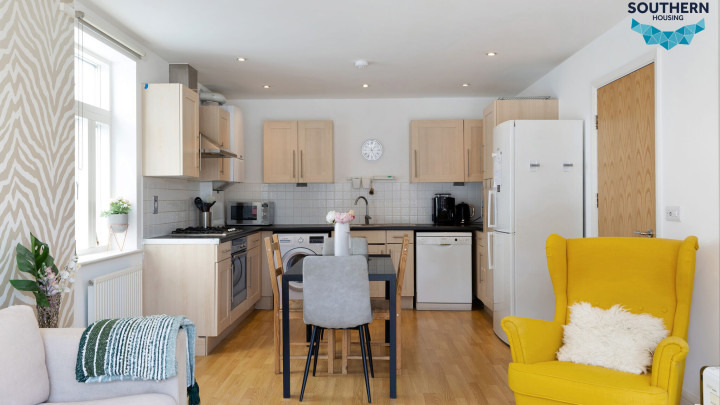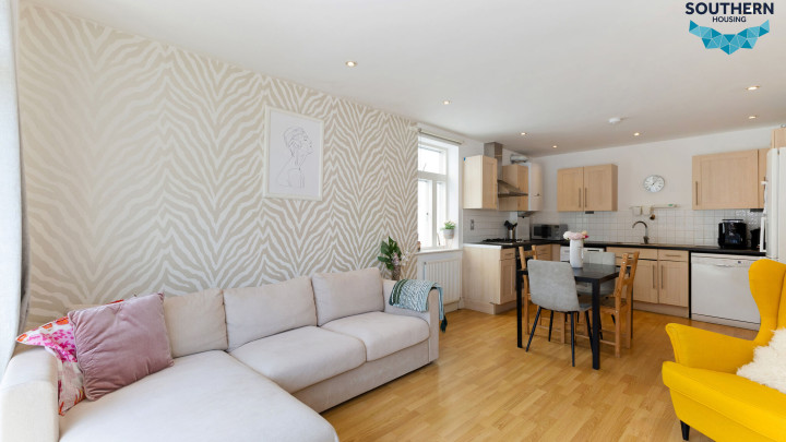 The kitchen and living area are open plan, creating a sociable space ideal for hosting. The living area is bright and inviting, thanks to large windows and access to a private balcony. The layout also allows for a separate dining area. The kitchen is well-maintained and functional, featuring an integrated oven, hob, and extractor fan, along with generous storage and worktop space.