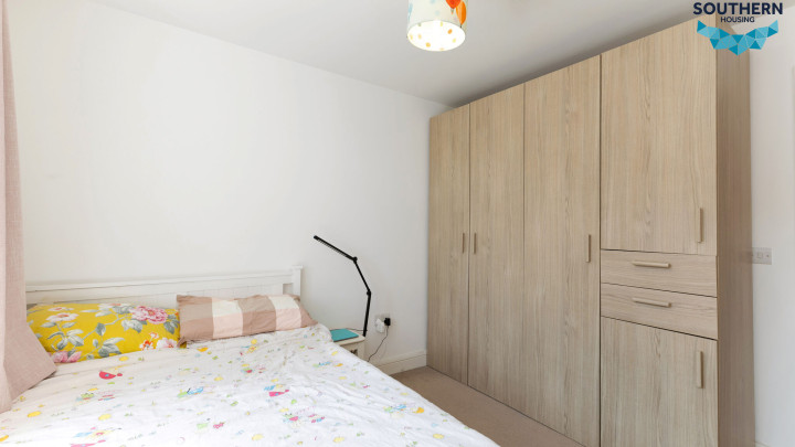 The apartment includes two double bedrooms, both offering ample room for furniture and personal touches. The main bedroom benefits from an en suite with a walk-in shower.