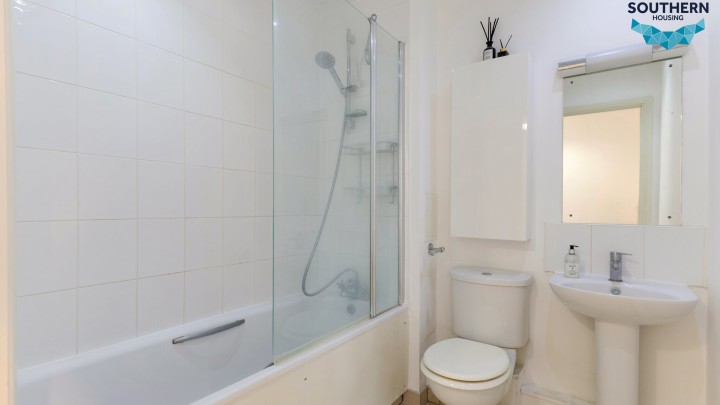 The main bathroom is finished with floor-to-ceiling tiles and includes a shower over the bath, providing a practical and comfortable space.