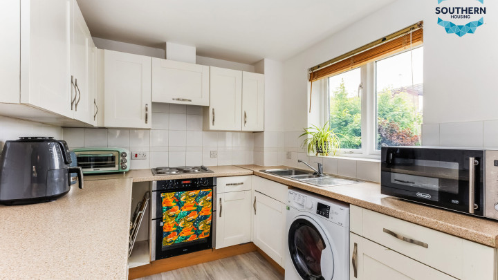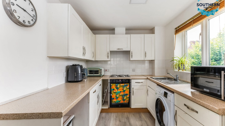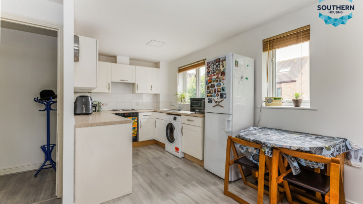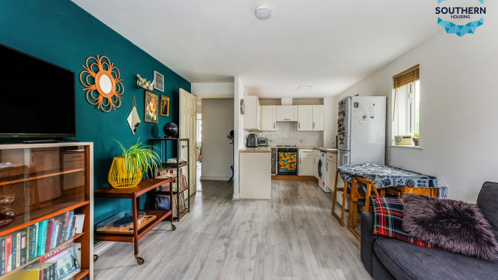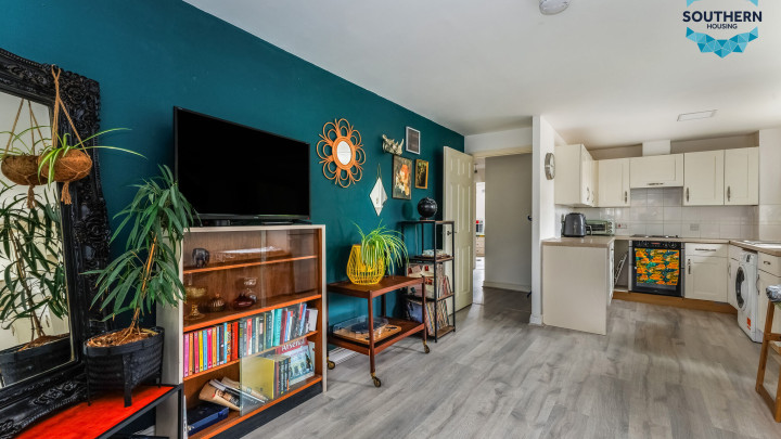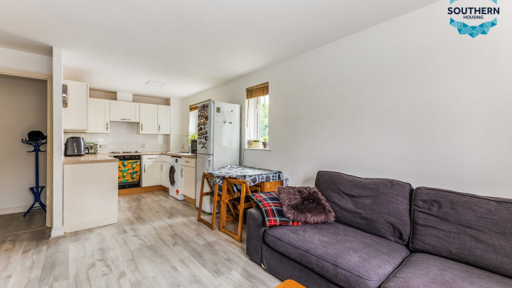 Moving on from here you will find the welcoming, open plan living room and kitchen. This space has plenty of room for separated a separate living and dining area and boasts lots of light thanks to large windows. The kitchen is stylish and modern, offering lots of storage and food prep space. You will find integrated appliances, including a oven, hob and extractor fan.