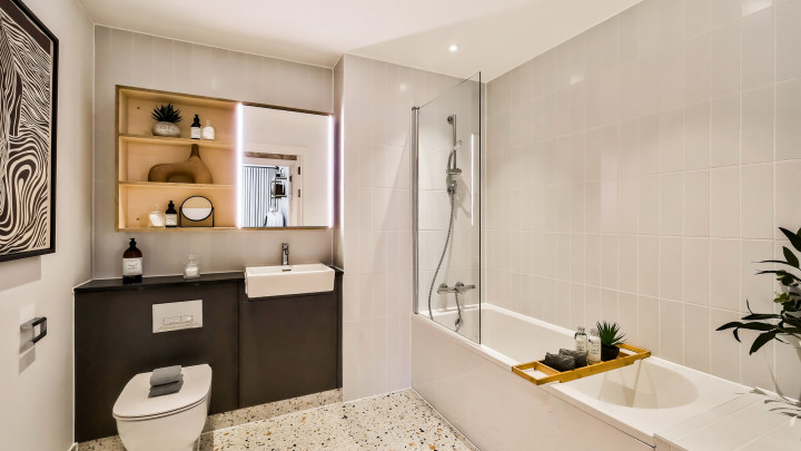 - Both the bathrooms and kitchens feature trendy terazzo tiling.