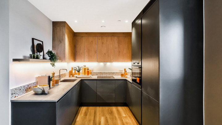 - The kitchens feature handleless units and a range of integrated Indesit appliances for a sleek, contemporary look.