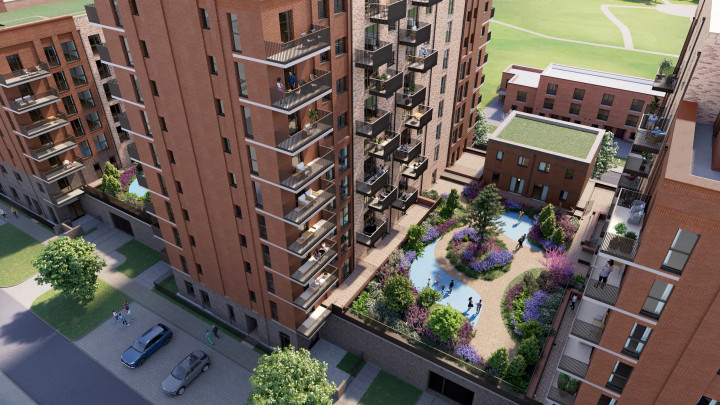 - All the homes have their own private outdoor space, as well as shared podium gardens at the heart of each group of buildings.
