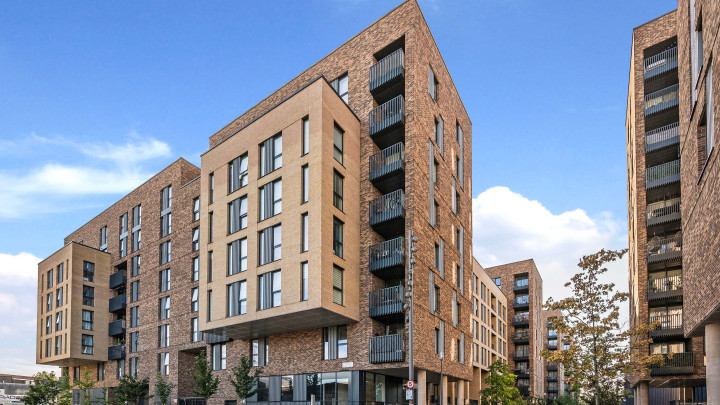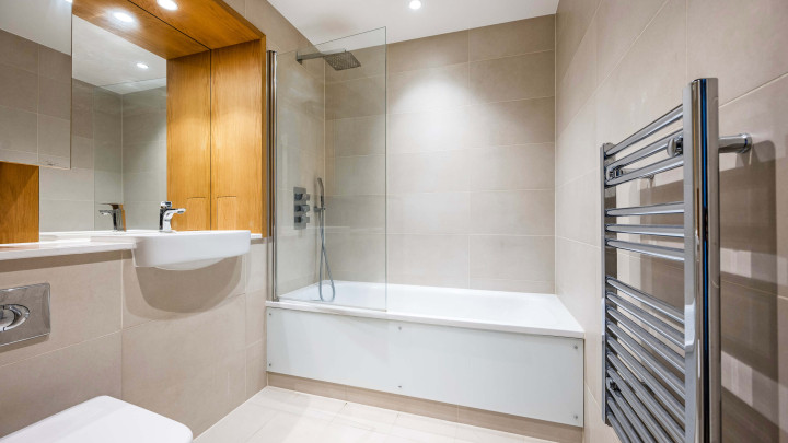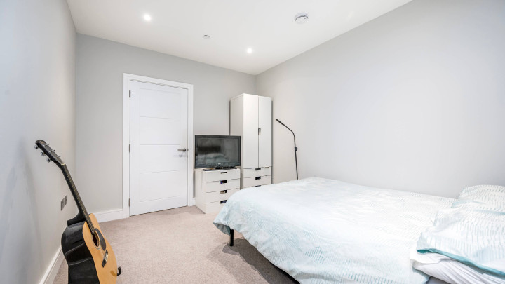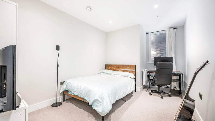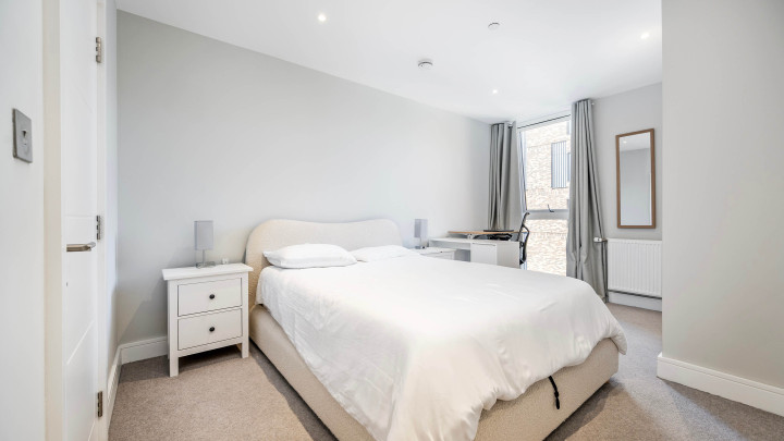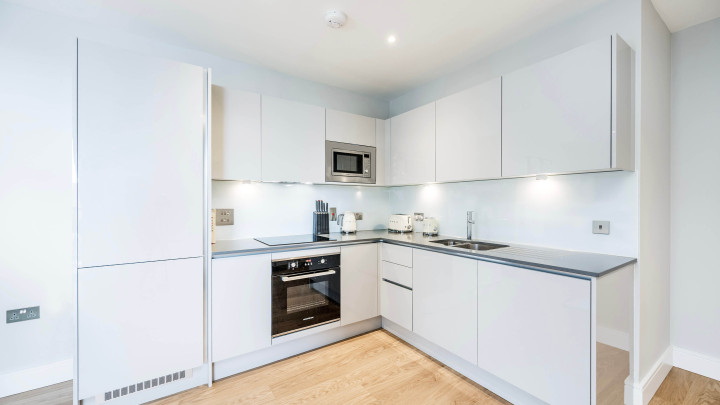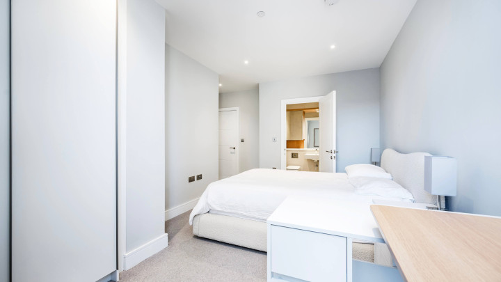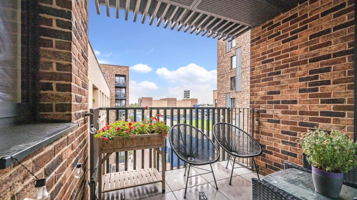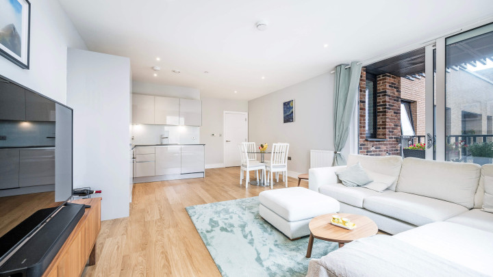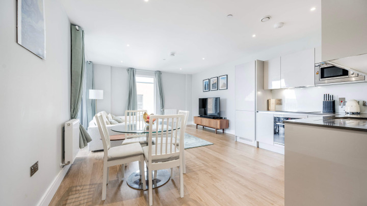 This stylish new apartment features open-plan living with floor-to-ceiling windows, a modern kitchen with integrated appliances and a private balcony. Residents enjoy central heating, secure underground bike storage, communal gardens and terrace, plus a 24-hour concierge service.
