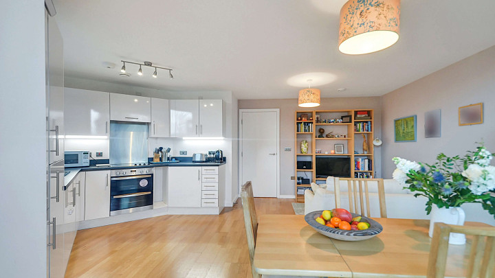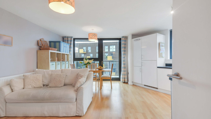 A stylish 2-bedroom, 1-bathroom apartment in the sought-after Kestrel House, offering contemporary open-plan living with floor-to-ceiling windows that flood the space with natural light. The modern kitchen comes complete with integrated appliances, seamlessly connecting to the living and dining area, while a private balcony provides an ideal spot to relax outdoors. Comfort is ensured with central heating throughout, and residents benefit from secure underground bike storage, a communal garden, and a professional concierge service.