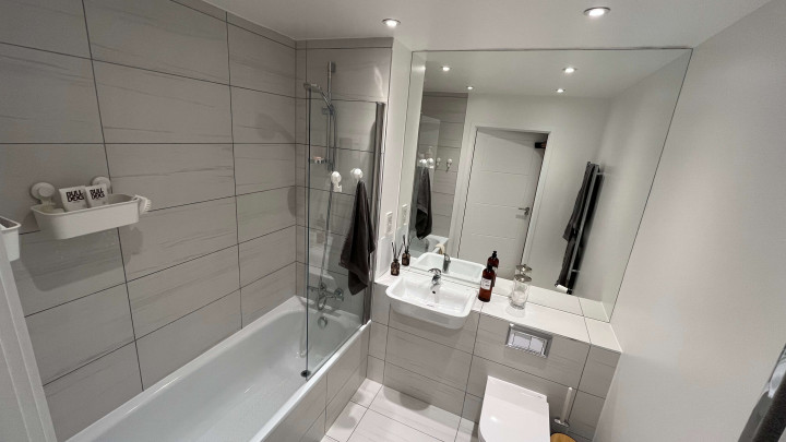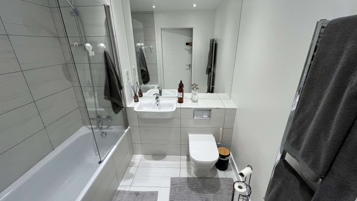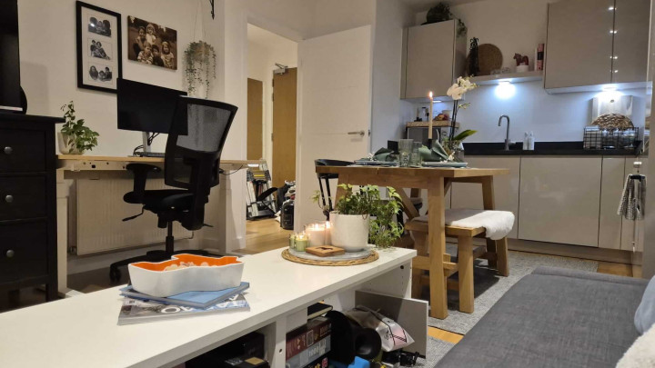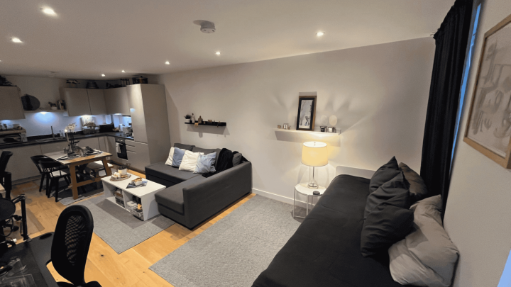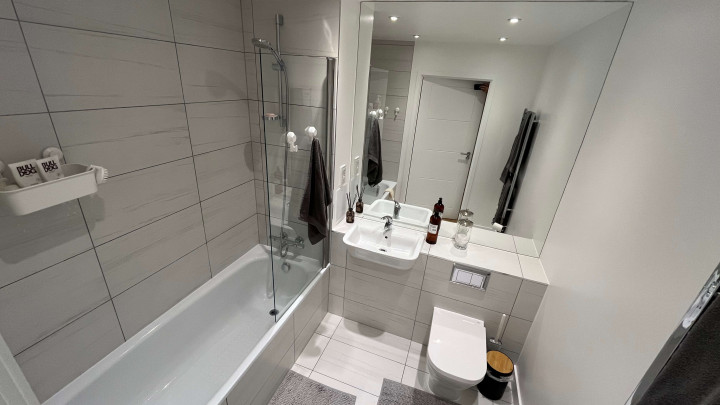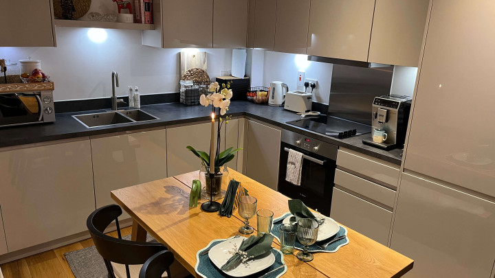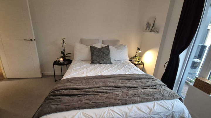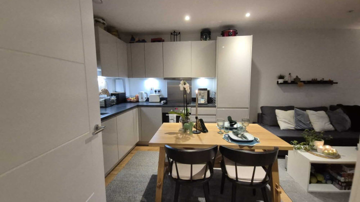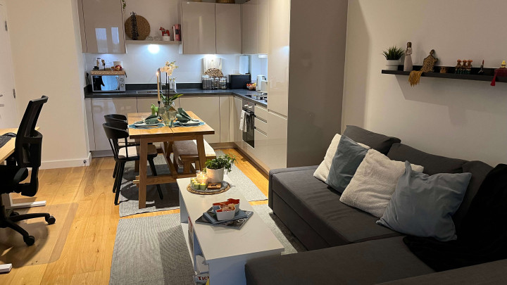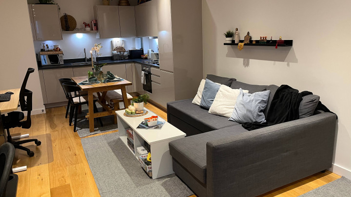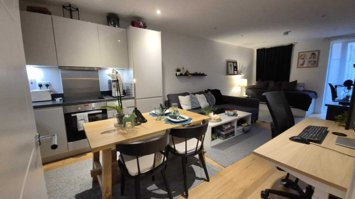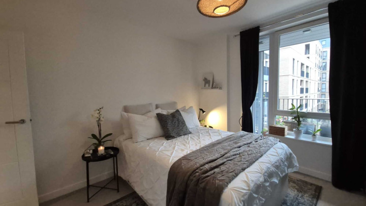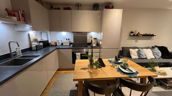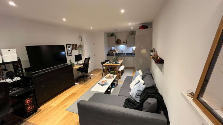 This stunning one-bedroom apartment offers contemporary living at its finest. The property features a bright and spacious open-plan kitchen and living area, enhanced by floor-to-ceiling windows that flood the space with natural light and provide a seamless connection to a private balcony, perfect for morning coffee or evening relaxation. The modern kitchen comes fully equipped with integrated appliances, while the bedroom includes a fitted wardrobe for ample storage. A sleek three-piece bathroom, communal garden access, and secure bike storage complete this stylish and practical home, ideal for first-time buyers or professionals seeking modern comfort.