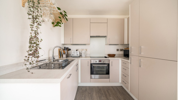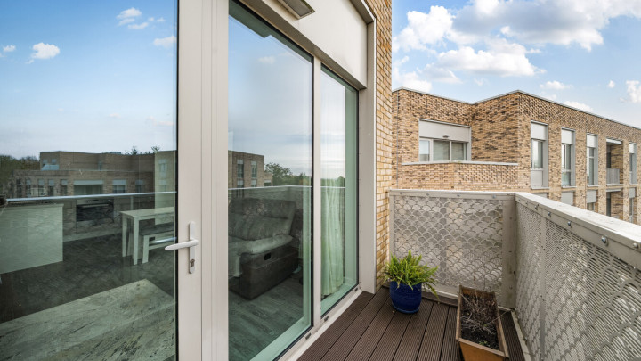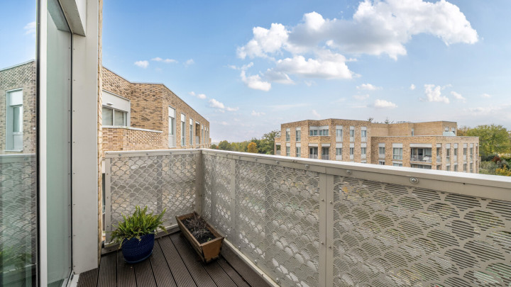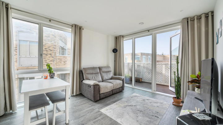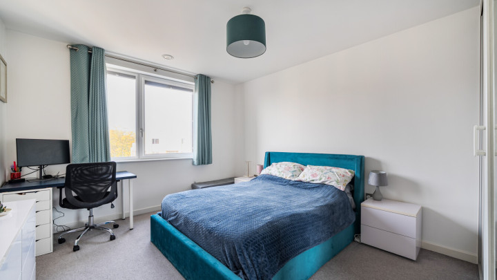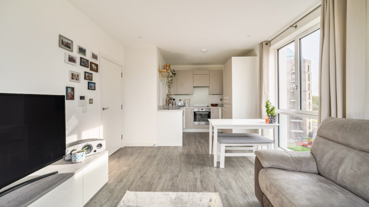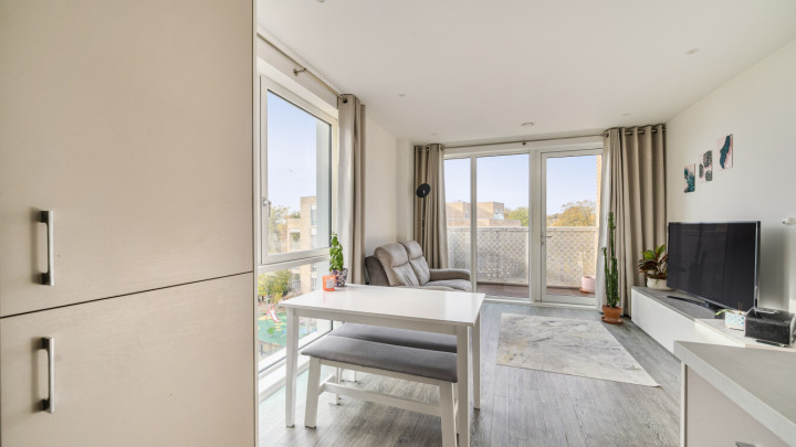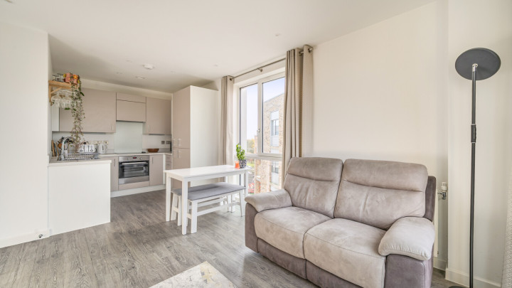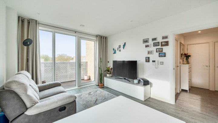 Enter this dual aspect apartment via a spacious hallway with storage. The light and bright open plan reception room has a south and east facing aspect opening onto a private balcony overlooking the communal gardens. The modern kitchen includes fully integrated appliances. A generous bedroom incudes a fitted wardrobe with sliding doors and has room for a home office. The accommodation is completed with a contemporary bathroom.