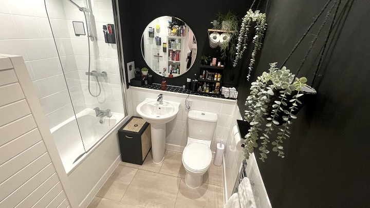 - Bathroom with Saloni wall tiles, thermostatic shower facility over bath and fitted shower screen