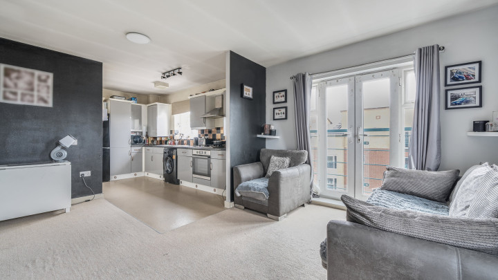 The property comprises an open plan living/dining room and kitchen, two double bedrooms, and a fitted bathroom. There's also a Juliet balcony in the living room.