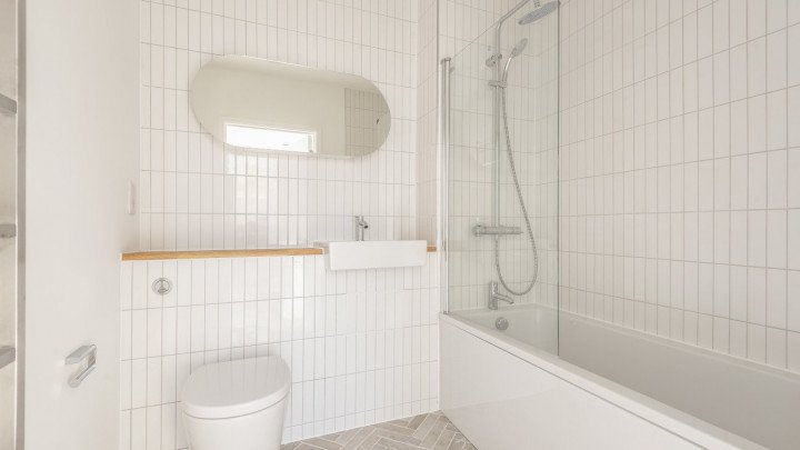 - China-white gloss full-height tiling above bath, basin and WC Tiled boxing to conceal WC cistern, basin and pipes coloured to match the walls