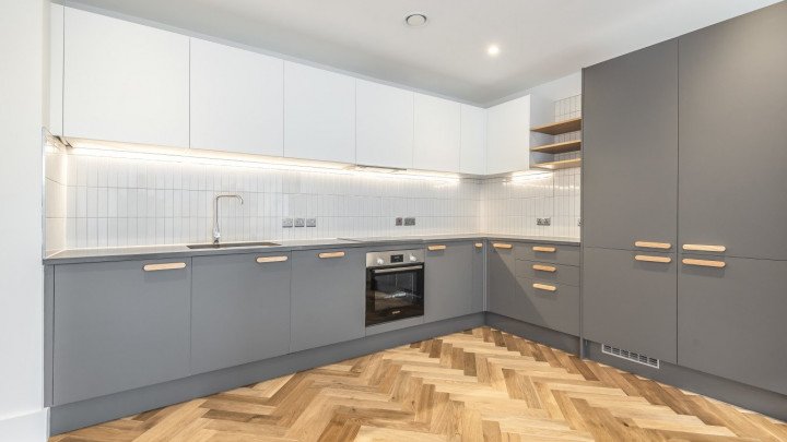 - Super matt graphite base and tall units with Allgood holt oak handles
