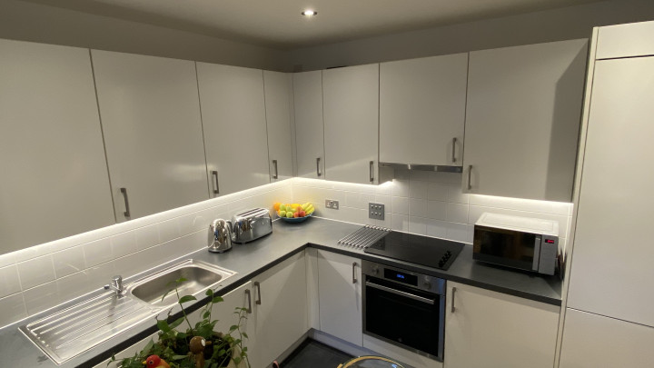 The kitchen comes equipped with white goods including integrated fridge freezer, washer/dryer and dishwasher. There is slate tiling in the kitchen area, with oak veneered engineered flooring throughout with carpet in bedrooms. The bathroom is tiled.