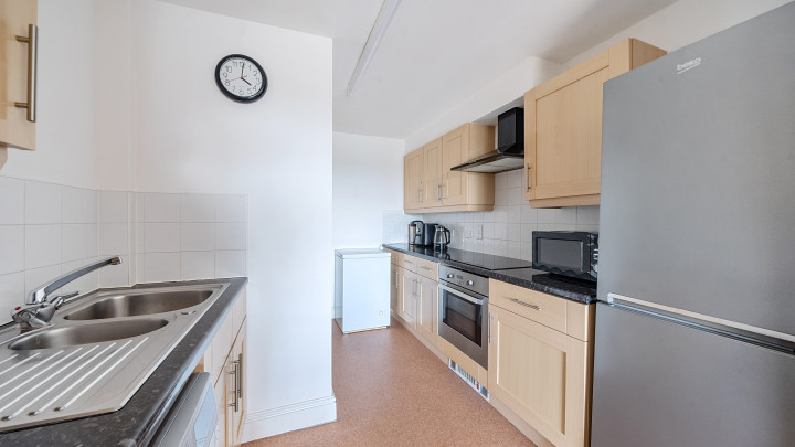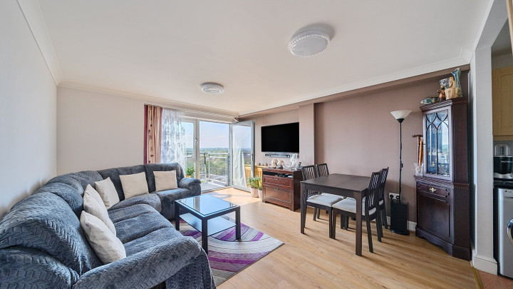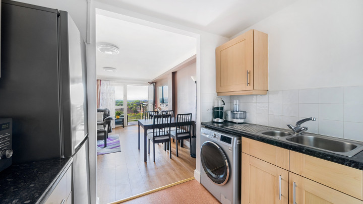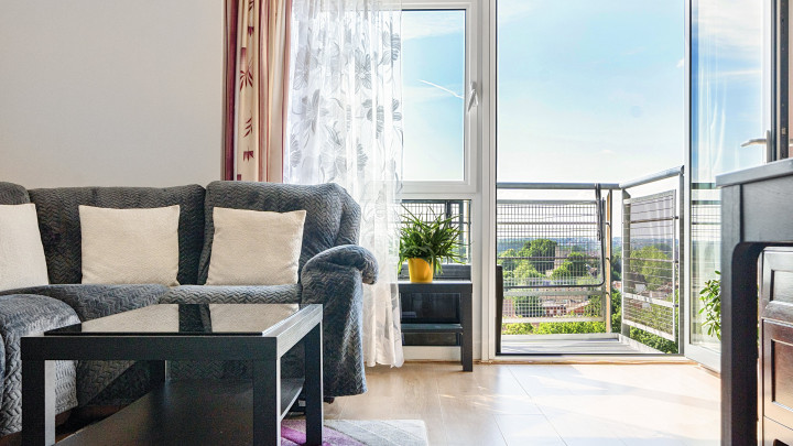 The property on the eleventh and offers a fantastic view of the town. The flat comprises an entrance hall with storage cupboards, a living room with access to a private balcony, a semi-separate modern fitted kitchen, two bedrooms and a bathroom; there's also a small study or additional storage room.