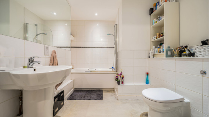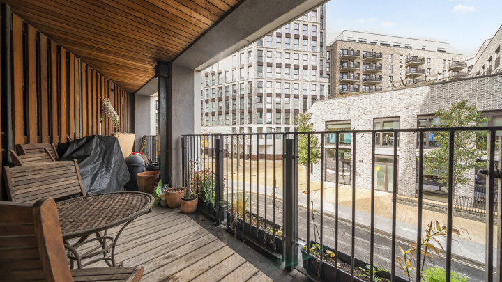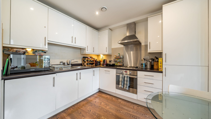This well maintained stylish apartment has a dual aspect, living/reception room with sliding doors to a private balcony. The apartment is full of natural light. The balcony is of good size which is good for relaxing and enteratining. The kitchen consists of modern white gloss units and has the benefit of intergrated appliances. Both bedrooms are of good size and come complete with fitted storage. There is a modern large family bathroom with a white three piece suite and shower over bath. The block boasts a large communal roof terrace.