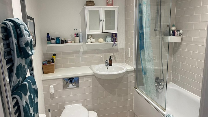 - Contemporary bathroom with over the bath thermostatic shower and shower screen