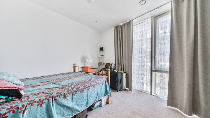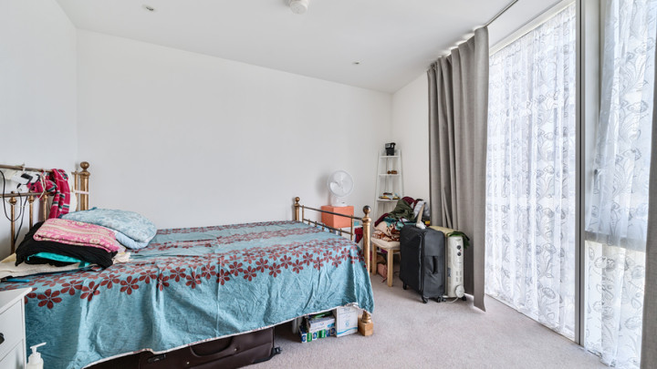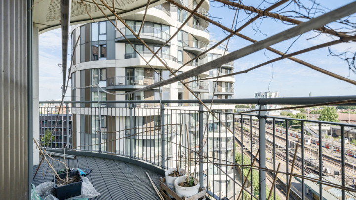 The property is on the sixth floor and comprises a wide living room, an open-plan kitchen, a bedroom and a bathroom. There's also a large private balcony surrounding the flat.