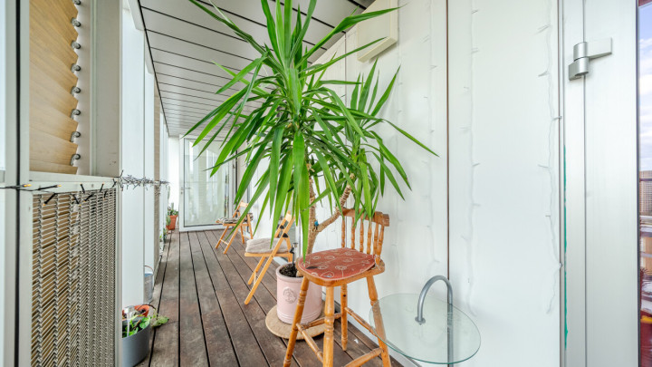Enter this spacious apartment via a large entrance hall, with storage, which leads to a well proportioned open plan living area with single large door opening onto to a full width covered balcony/wintergarden. The kitchen, fitted with high gloss wall and base units, includes integrated oven hob, extractor fan and fridge/freezer. There are two double bedrooms, each with a door onto the balcony, the master also benefitting from a built in wardrobe. A contemporary family bathroom completes the accommodation.