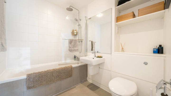 - Family bathroom with shower over bath. New fittings include sink, taps, mirror, shower bar, towel bar, door hook, toilet roll holder, bathroom tiling and shower screen.