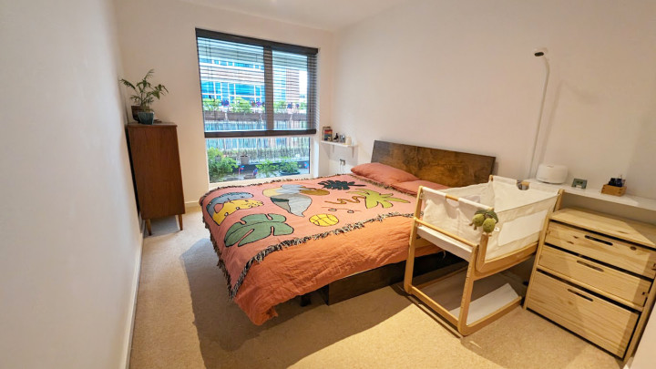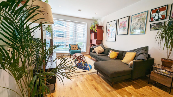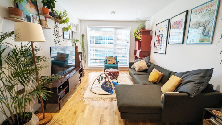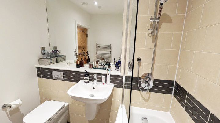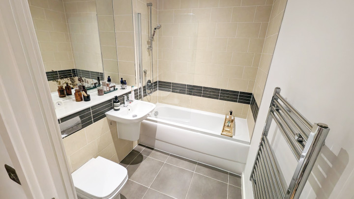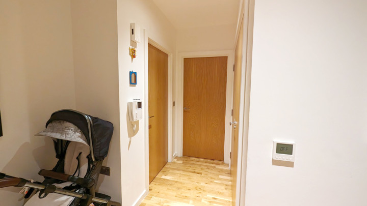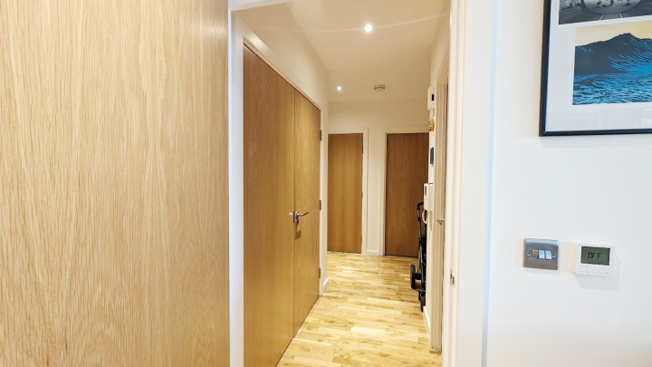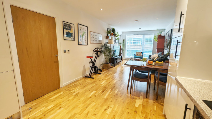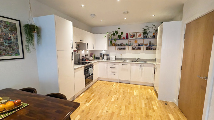 A smart, spacious first floor flat in a sought-after residential area within a secure building. The flat itself comprises of two carpeted large double bedrooms, one with fitted wardrobes. Full bathroom with a heated towel rail and shower over the bath. The flat benefits from hardwood flooring with underfloor heating throughout, a fully integrated kitchen/living and floor to ceiling windows in all rooms for plenty of natural light. Off of the living area is a private balcony, and in the hallway is a large storage/ utility cupboard.