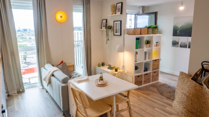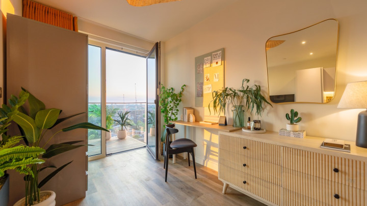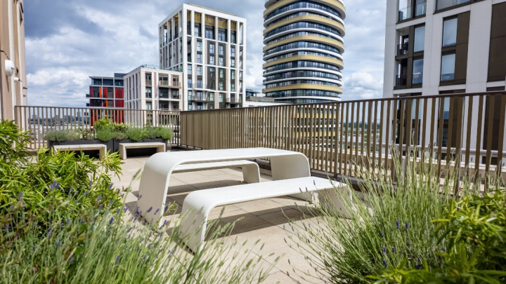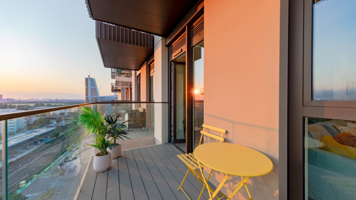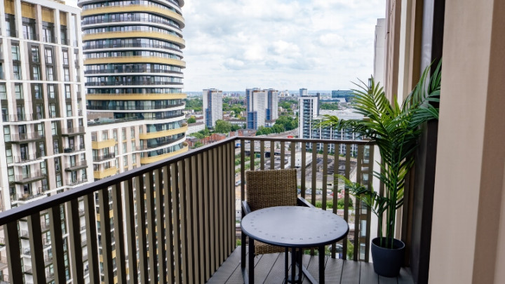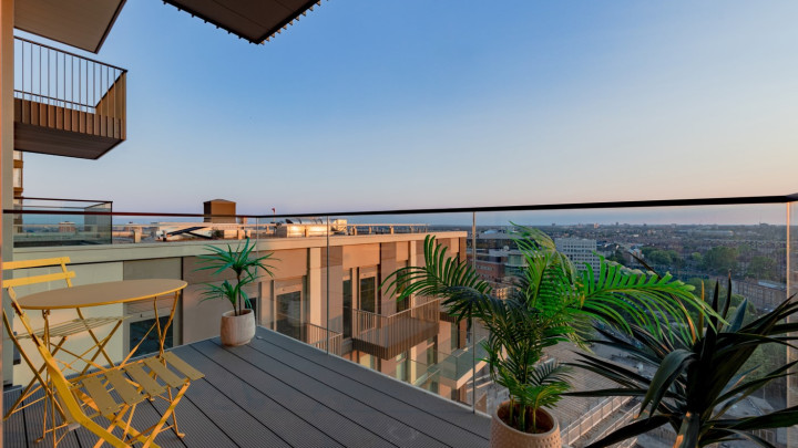 Each apartment is thoughtfully designed with full-height windows, integrated appliances, and a private balcony. You'll also have a 24-hour concierge, estate management, and a 15th floor communal roof terrace.