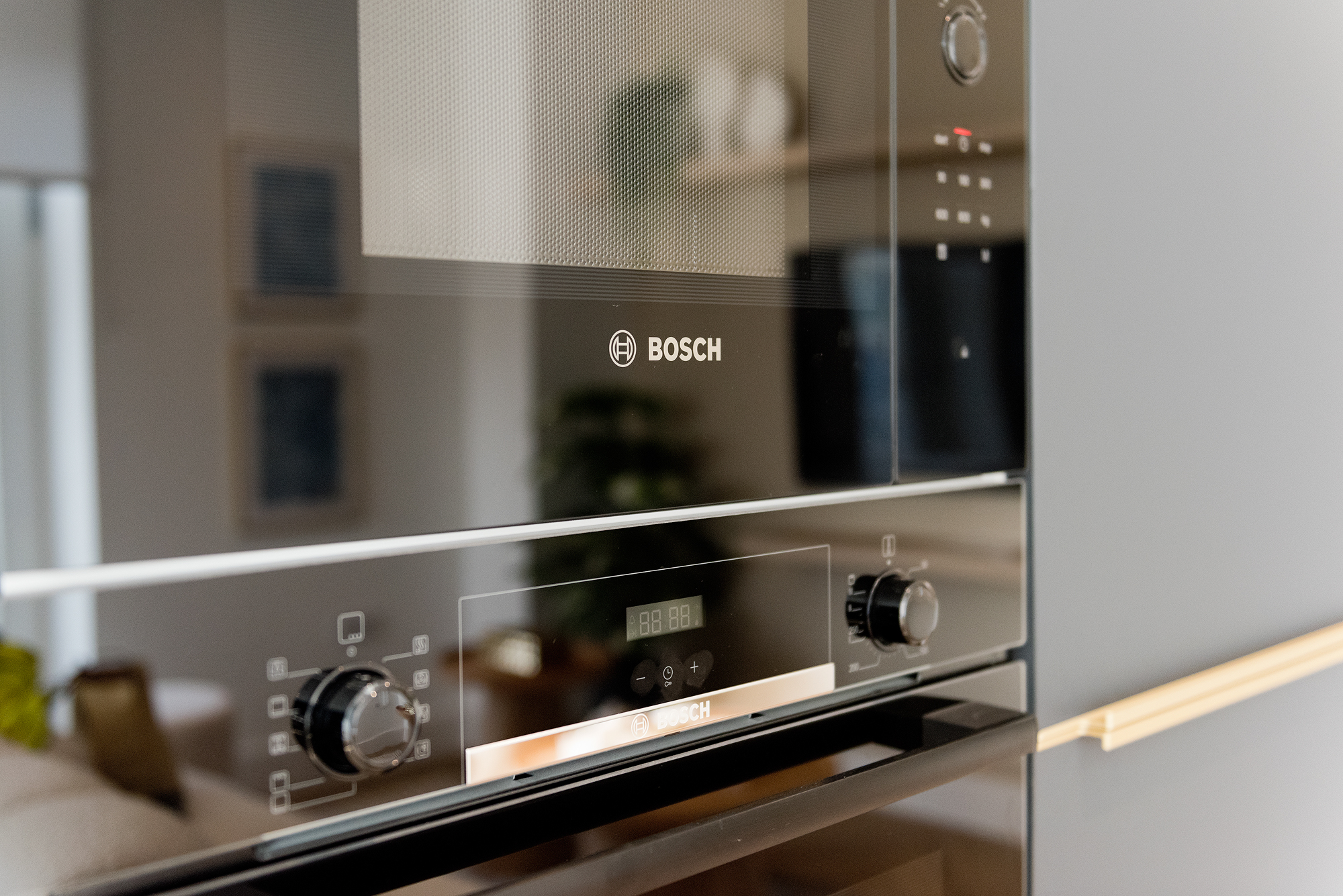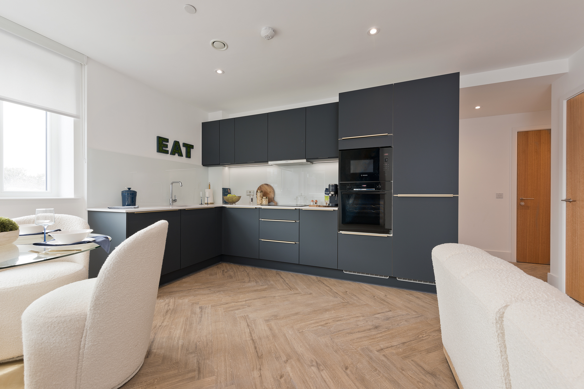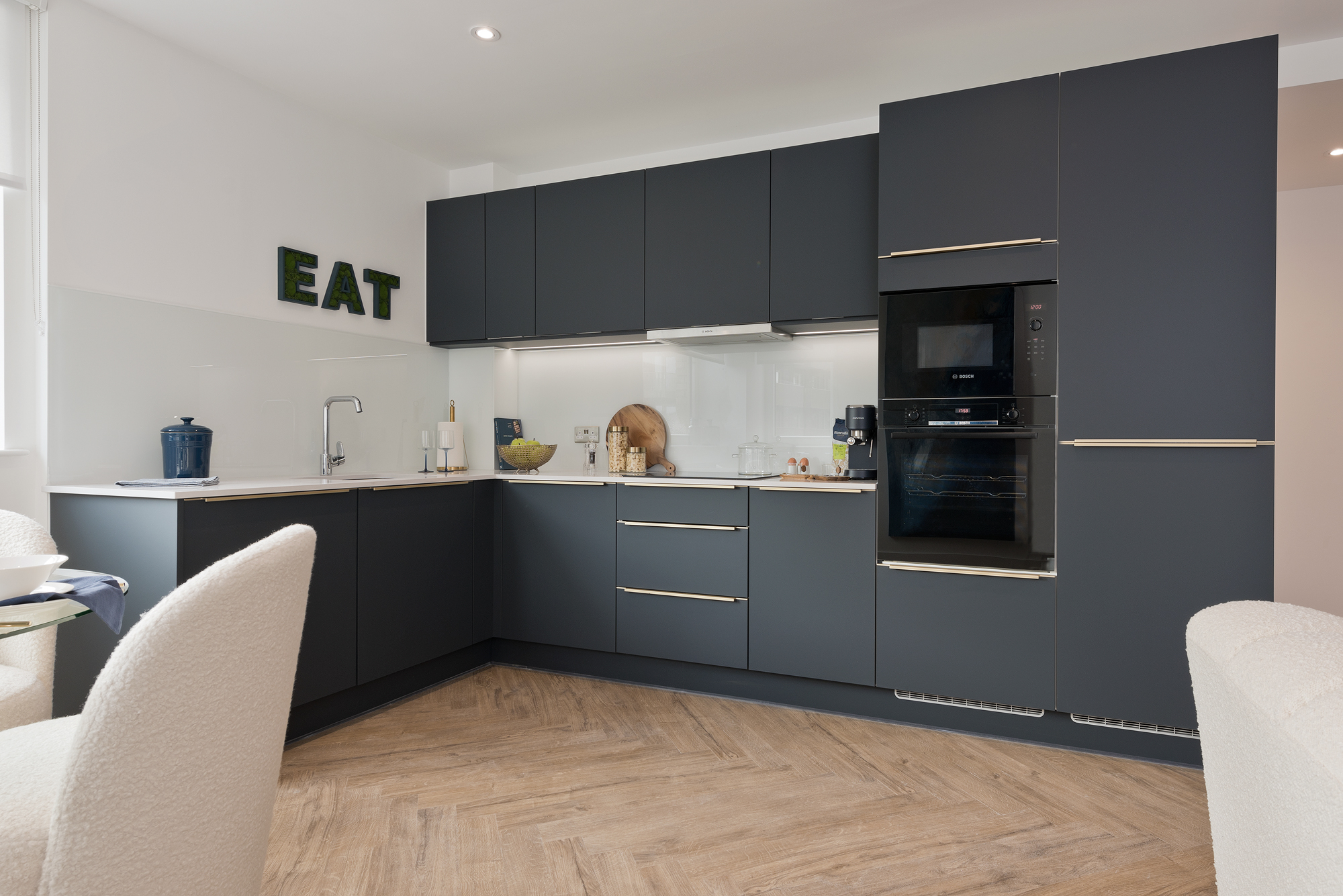 Kitchen - the modern kitchens at The Beacon, Bow are designed to impress, featuring sleek navy-blue cabinetry with brass handles for a sophisticated finish. Integrated appliances ensure a seamless look, while durable quartz worktops provide both style and practicality.