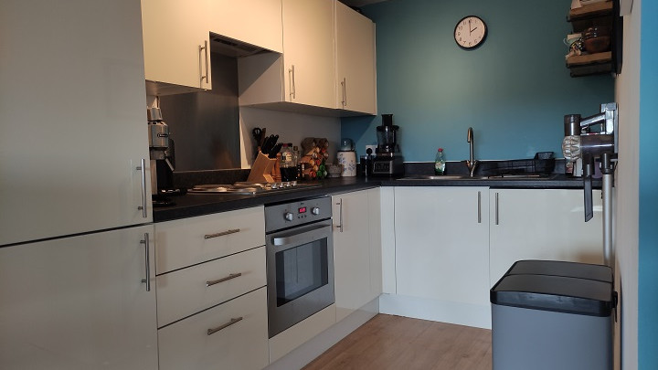 - Fully fitted kitchen in white high gloss finish, with built in appliance